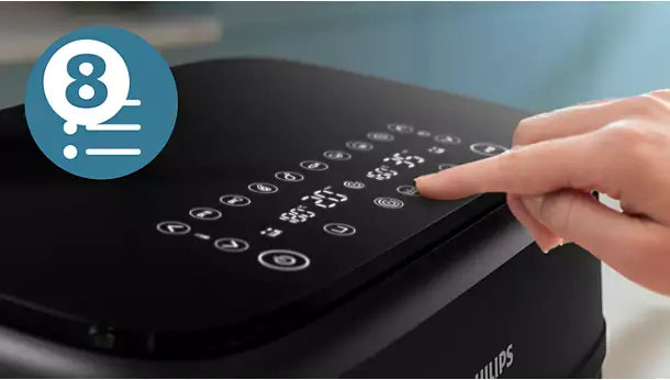 Plus besoin de vérifier des informations ou de les deviner. Grâce à l'écran tactile, l'Airfryer à double panier propose des températures et des durées prédéfinies pour les frites fraîches, les frites surgelées, le poulet, la viande, les légumes, poisson, les gâteaux, et le réchauffage.